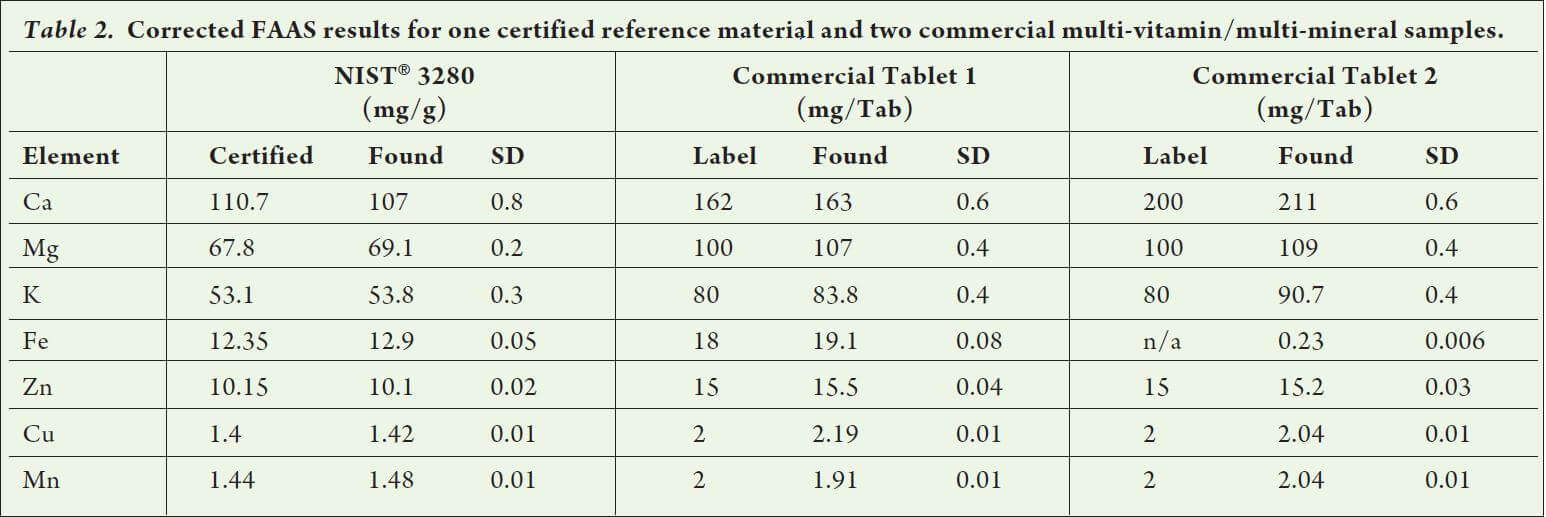 هفت عنصر در دو قرص مولتی مینرال معدنی موجود در بازار ، یک ماده مرجع استاندارد NIST® و یک ماده مرجع تجاری که یک رژیم غذایی ترکیبی را شبیه سازی می کند ، تعیین می شود.