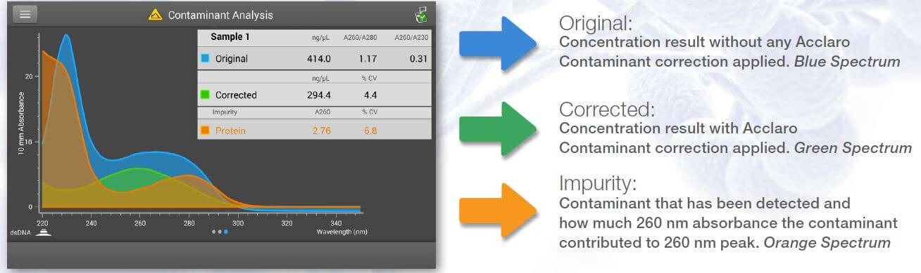 در کدام برنامه دستگاه نانودراپ ترمو فیشر NanoDrop One می توانم از ویژگی شناسایی آلودگی Acclaro استفاده کنم؟ویژگی شناسایی آلودگی Acclaro در برنامه های dsDNA ، RNA و پروتئین A280 پیاده سازی شده است.شناسایی آلودگی Acclaroویژگی تشخیص آلودگی Acclaro روی طیف سنجی نانودراپ NanoDrop One چگونه کار می کند؟ ویژگی شناسایی آلودگی Acclaro از یک روش شیمی برای تجزیه و تحلیل اجزای شیمیایی موجود در یک نمونه...