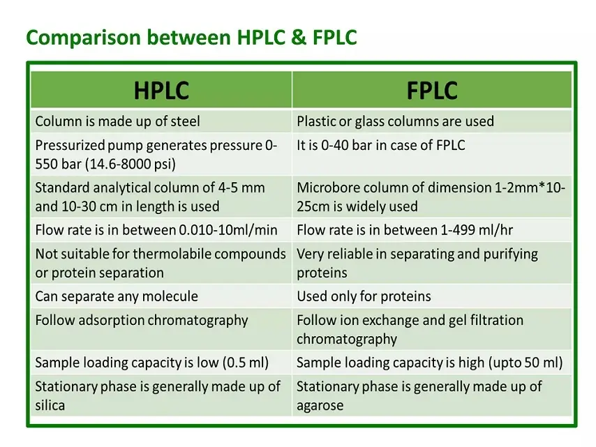 FPLC Vs HPLC Fast protein liquid chromatography  ( FPLC )  Vs High performance liquid chromatography ( HPLC )مقایسه HPLC با FPLCکروماتوگرافی مایع پروتئینی سریع Fast protein liquid chromatography (FPLC) و کروماتوگرافی مایع با کارایی بالا high performance liquid chromatography (HPLC) هر دو تکنیک های کروماتوگرافی مایع هستند که برای جداسازی مخلوط ها استفاده می شوند، اما چندین تفاوت کلیدی دارند.  هدفFPLC برای خالص سازی بیومولکول های بزرگ مانند پروتئین ها،...