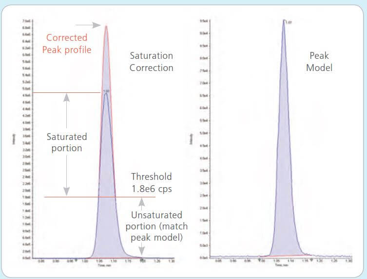 (سمت چپ) قسمت غیراشباع پیک توسط SignalFinder برای برون یابی مشخصات و شدت پیک صحیح استفاده می شود.