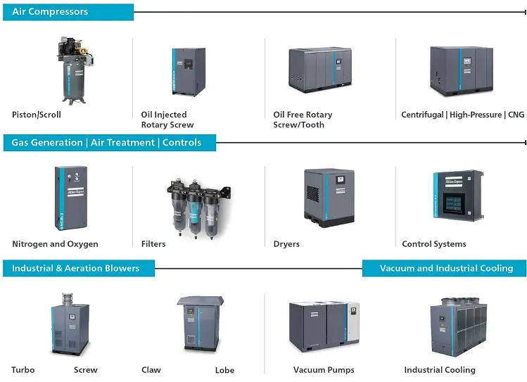 کمپانی اطلس کوپکو Atlas copcoدارای رنج گسترده ای از تجهیزات کمپرسور، خشک کن dryers ، چیلر chillers ، blowers و کنترل می باشد.